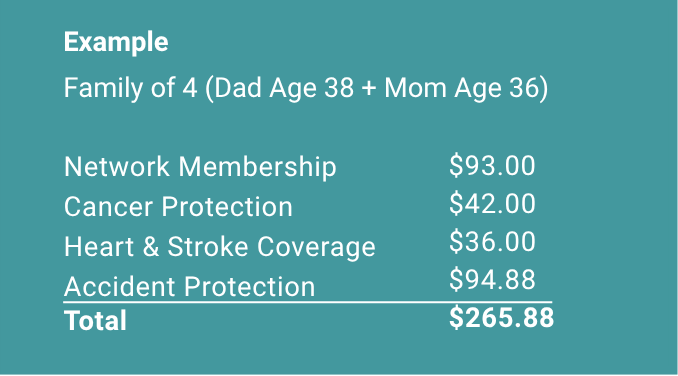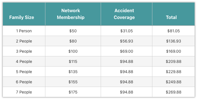| Family Size | Network Membership | Accident Coverage | Total |
